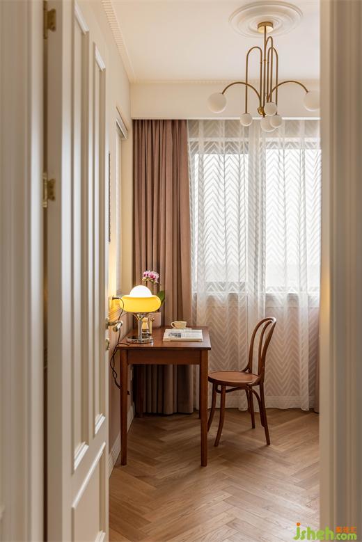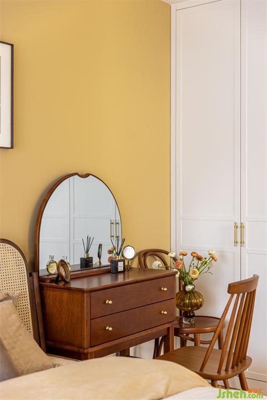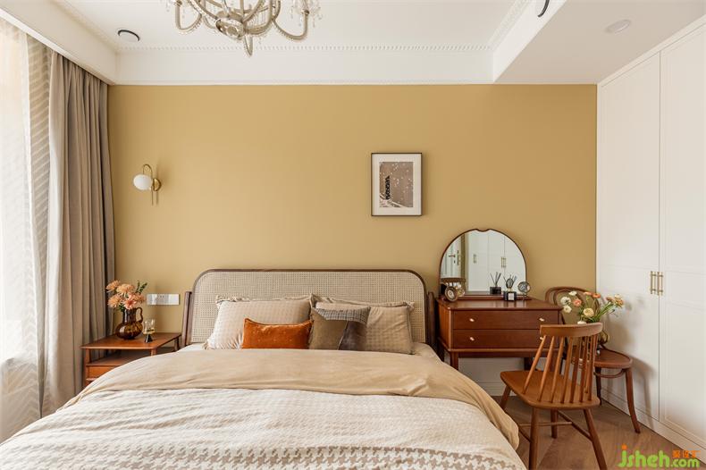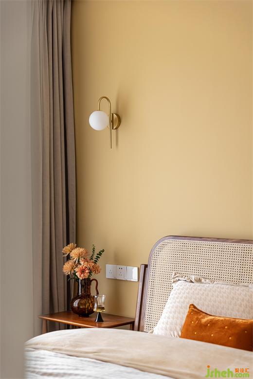 溫和的暗檸檬黃作為墻面基調(diào),并進(jìn)行分色處理,讓空間更具層次感。藤編床頭、胡桃木梳妝臺(tái)、造型吊燈、奶咖窗簾,南京裝修設(shè)計(jì)公司多重材質(zhì)在空間中奇妙碰撞,營(yíng)造出精致摩登又不失經(jīng)典浪漫的奇妙氛圍,細(xì)微末節(jié)處充滿精致。