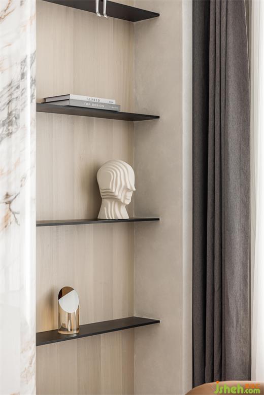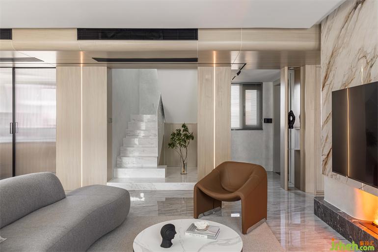 墻面木色延伸至頂,增加空間縱深感,南京家裝設計墻面內嵌線性燈,功能性與裝飾性相結合。