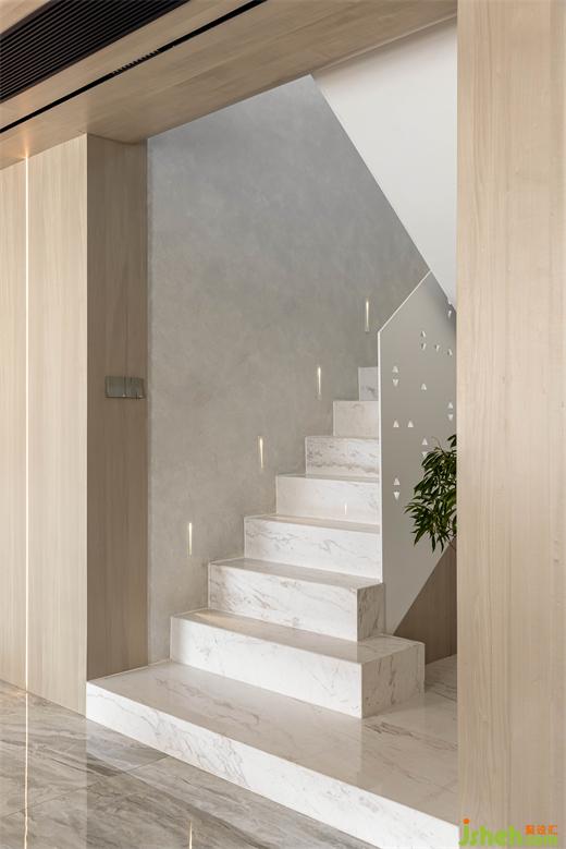 定制的鐵藝鏤空扶手,讓樓梯區(qū)域更加輕盈通透,感應踢腳燈令上下樓更為便捷。