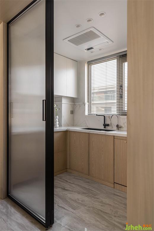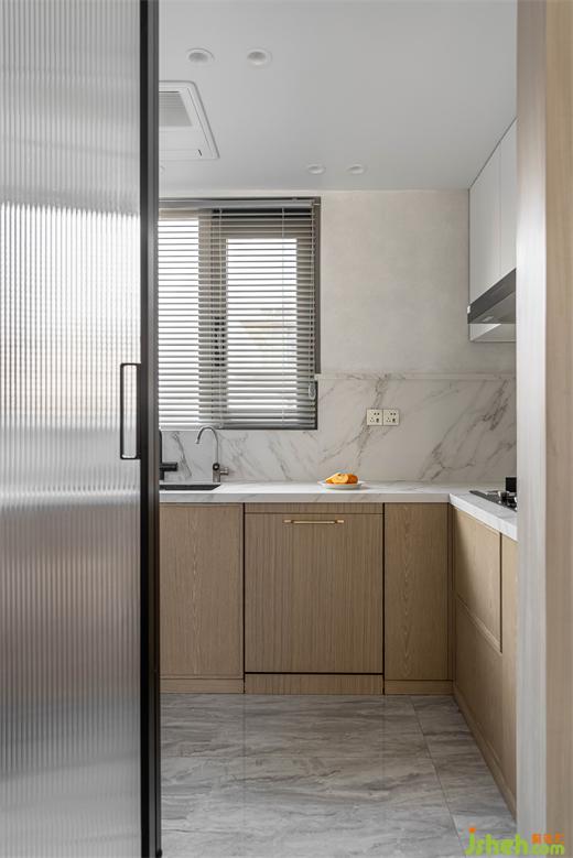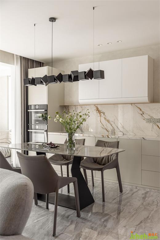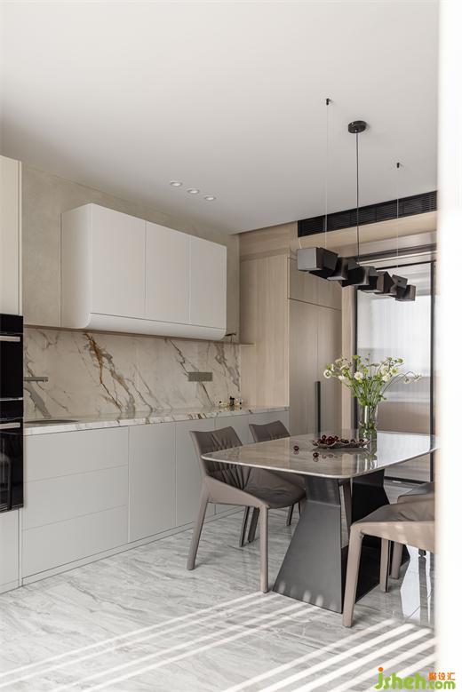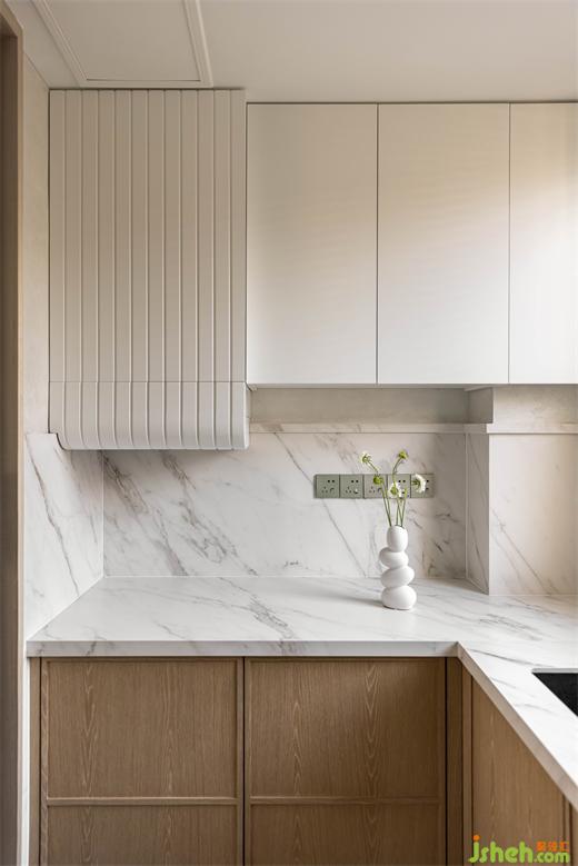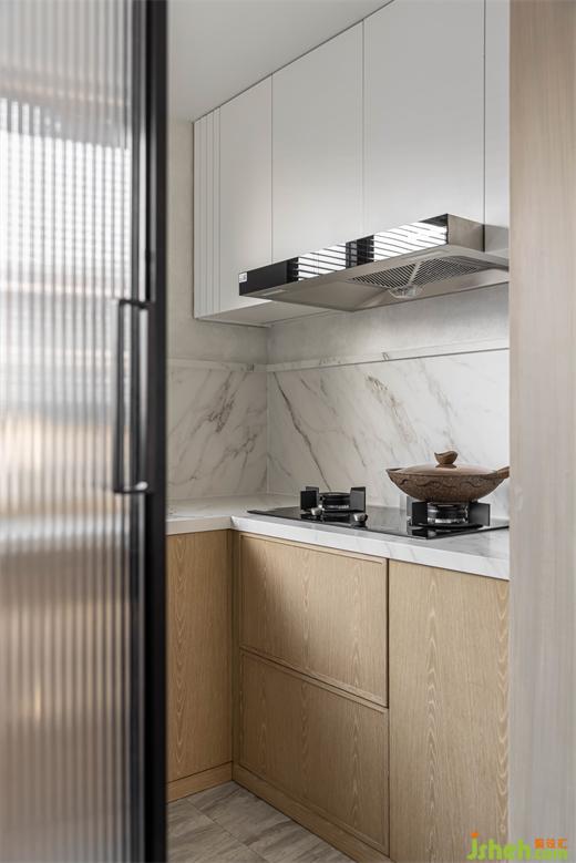 臺(tái)面巖板延伸上墻,豐富空間層次感。南京家裝設(shè)計(jì)內(nèi)嵌冰箱與墻面木紋同色,在空間上保持了一致性。