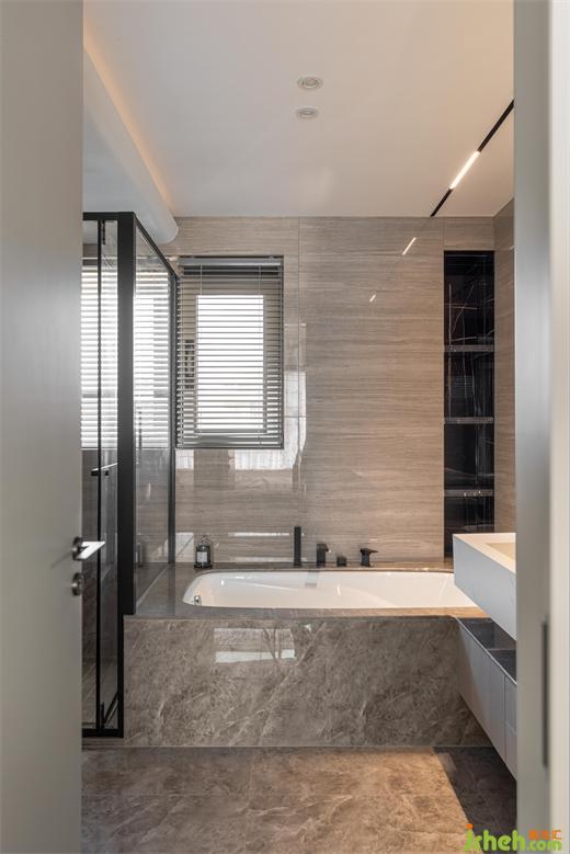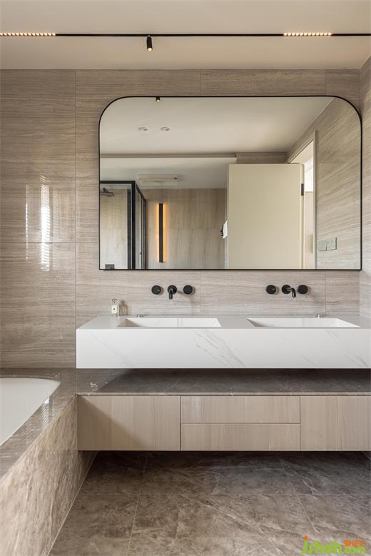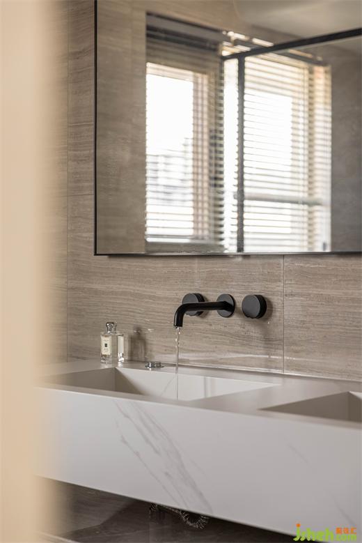 雙臺盆設(shè)計,洗漱空間寬敞,同時使用時候也不會受到影響,嵌入式龍頭和一體式的石材臺盆,減少衛(wèi)生死角。
