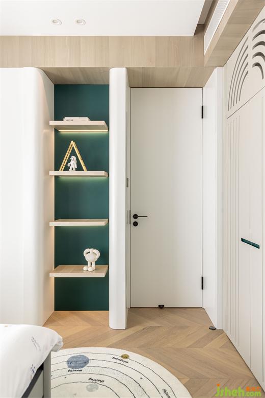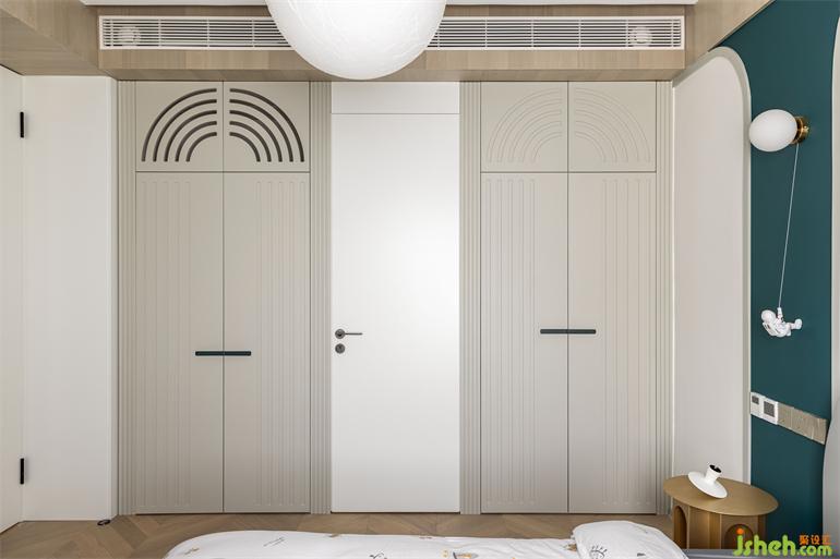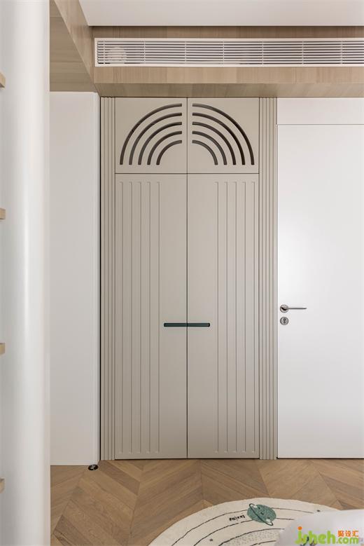 回風(fēng)口巧妙地隱藏在柜門后,與柜子融為一體;兩個柜體之間是一個通往衛(wèi)生間的隱形門。