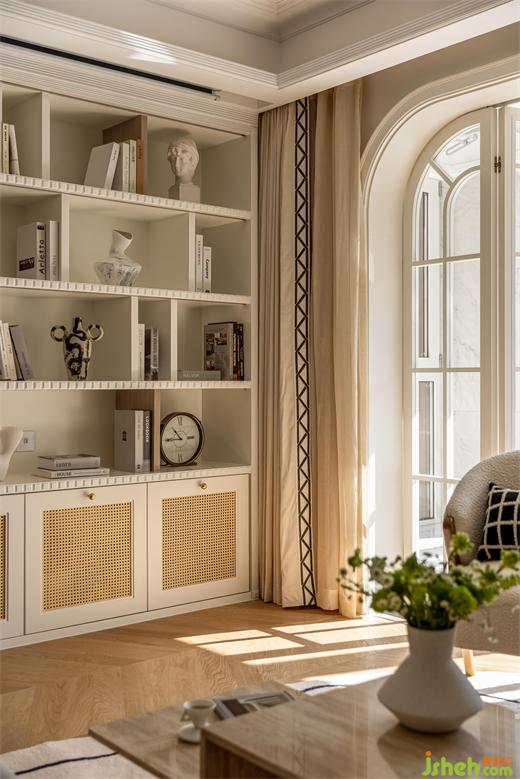 客廳書架奧松板現(xiàn)場制作,裝修設(shè)計結(jié)合木雕花線條現(xiàn)場刷油漆,藤編柜門板工廠定制,點綴了幾個豎隔板貼木飾面與餐邊柜做呼應(yīng),如此復(fù)雜的工序最終呈現(xiàn)了層次豐富、極具觀賞區(qū)的書柜。