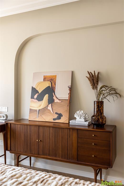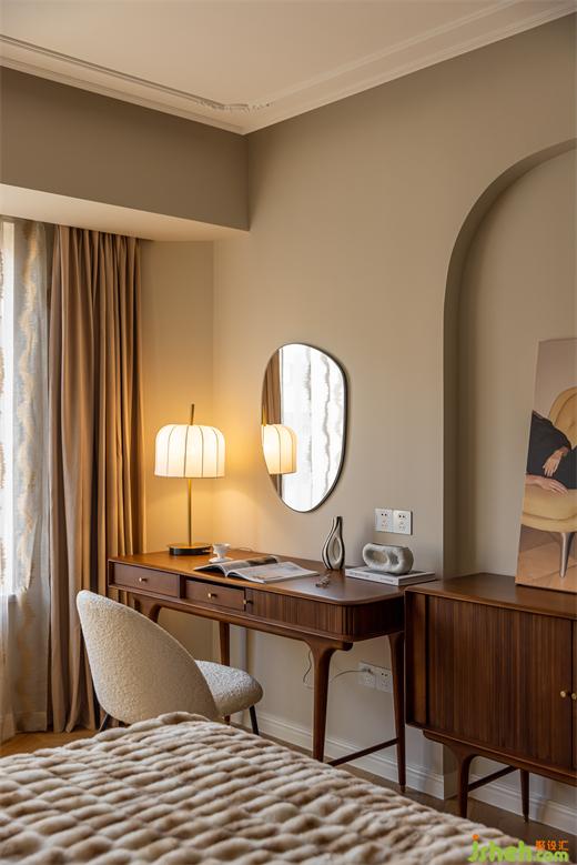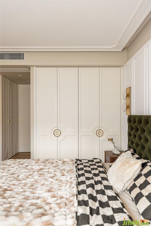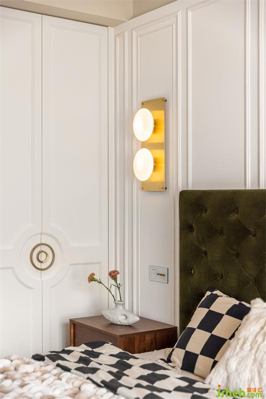 主臥延續(xù)客餐廳柔美的淺色系,綠色絨布床與棋盤(pán)格床品搭配復(fù)古典雅,裝修設(shè)計(jì)深紅色柚木梳妝臺(tái)與邊柜紋理通直,色澤光亮,黃銅色燈具與柜門(mén)金屬把手點(diǎn)綴精致感,臥室呈現(xiàn)出一種浪漫優(yōu)雅且溫柔動(dòng)人的氣場(chǎng)。
