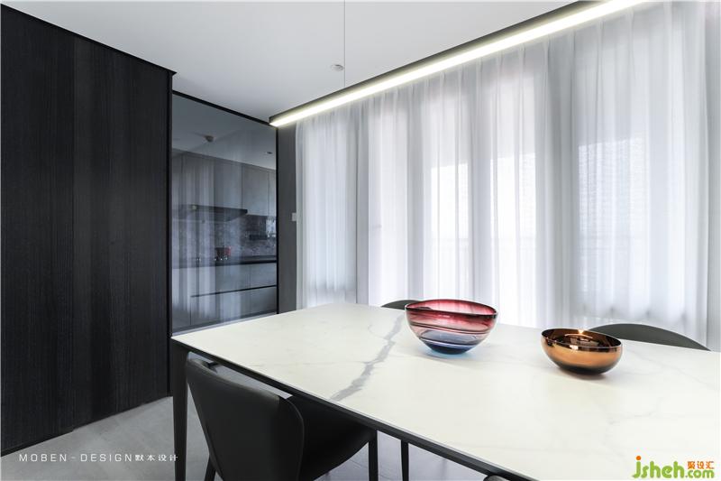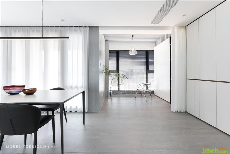 大而簡潔的白色頂面,垂感極佳的白色紗簾,石材與木地板的拼接,空間分割延伸形成的線條,共同構建平衡和諧的空間框架