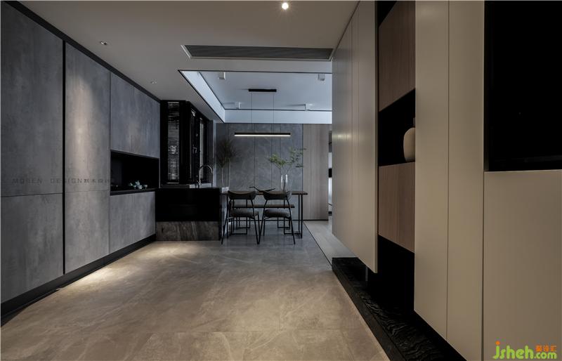 大理石地臺挑高,配合暗藏?zé)魩?,削弱空間壓抑感