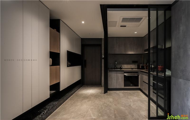 入戶收納柜是電視背景的延伸設(shè)計(jì),整體懸空