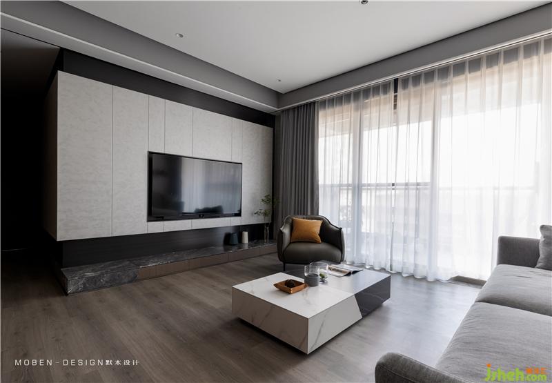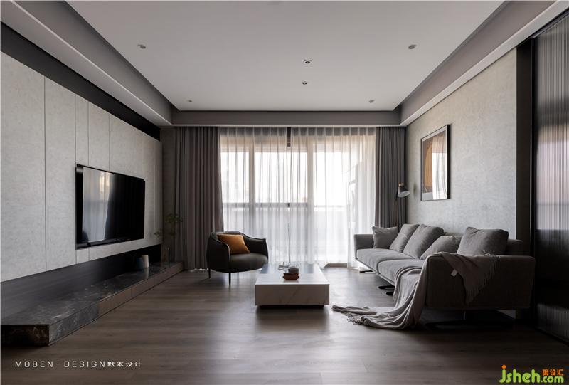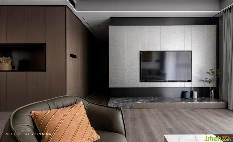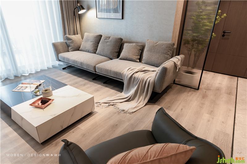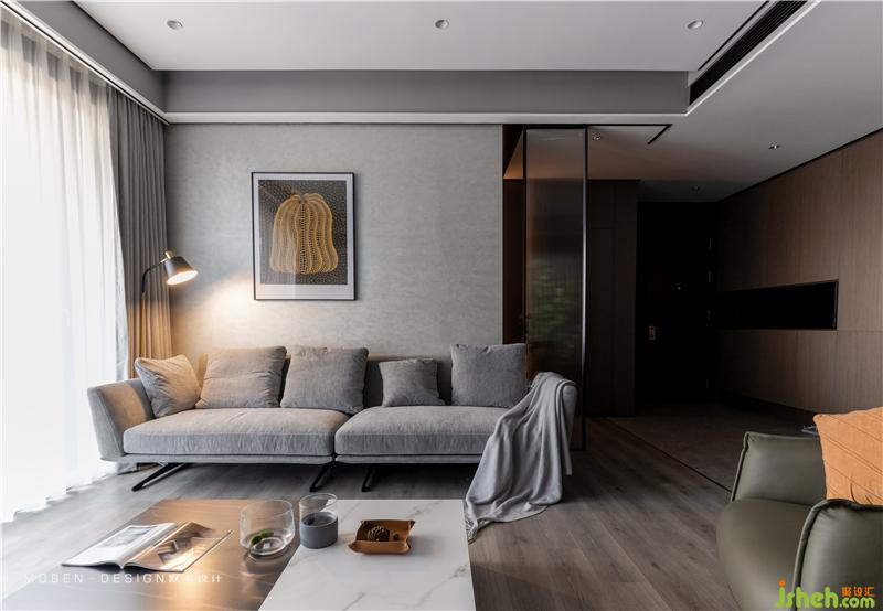 天花高低吊頂、灰色地磚和木地板的分割、形成區(qū)域分塊的效果