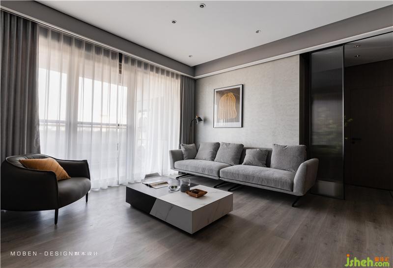 灰色布藝沙發(fā)、大落地窗