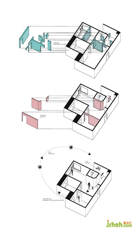 本項(xiàng)目是一個(gè)60㎡兩室一廳的小宅。我們首先是對(duì)功能進(jìn)行了從新的邏輯梳理,將空間按照使用動(dòng)線(xiàn)的不同和空間對(duì)采光量需求不同把原有兩室一廳的空間劃分為兩室兩廳。