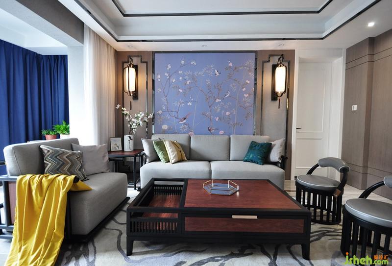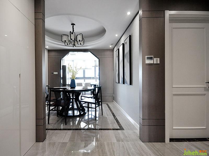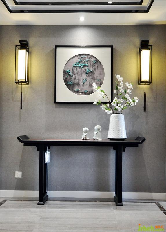 回字型吊頂,金屬線條巧妙地分割了空間,兩盞暖黃的中式壁燈、中式案幾、花瓶,傳遞出端莊寧靜的感覺。