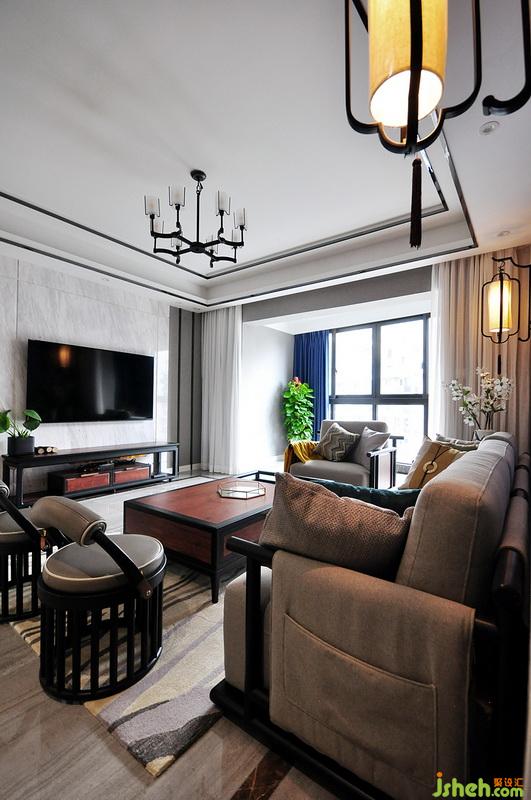 客廳設(shè)計公司使用爵士白大理石電視背景墻,金屬線條、地面拼花,整個空間以現(xiàn)代的材質(zhì),洋溢著中式的韻味,沙發(fā)背景墻選用冷色的壁畫墻布,讓人眼前一亮,木飾面又讓空間溫暖而有質(zhì)感。