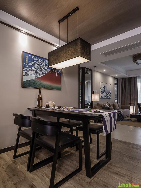 廚房和餐廳之間居酒屋的設(shè)計(jì)靈感來自近兩年大熱的溫暖日劇《深夜食堂》。設(shè)計(jì)公司這樣的一個設(shè)置既豐富了日式的主題概念,也是廚房與餐廳之間互動的橋梁。做飯不僅僅是一個人的家務(wù),也可以是多人的有趣互動,站在廚房能夠清楚明白的和餐廳的親朋好友進(jìn)行對話,端菜也不用進(jìn)出來回跑腿,只需要通過這個小“酒臺”就可以輕松遞至餐廳。也可以當(dāng)作一個小酒吧來使用,具有家庭情趣,實(shí)用也非常符合主人的審美。
