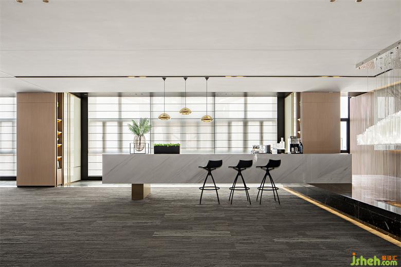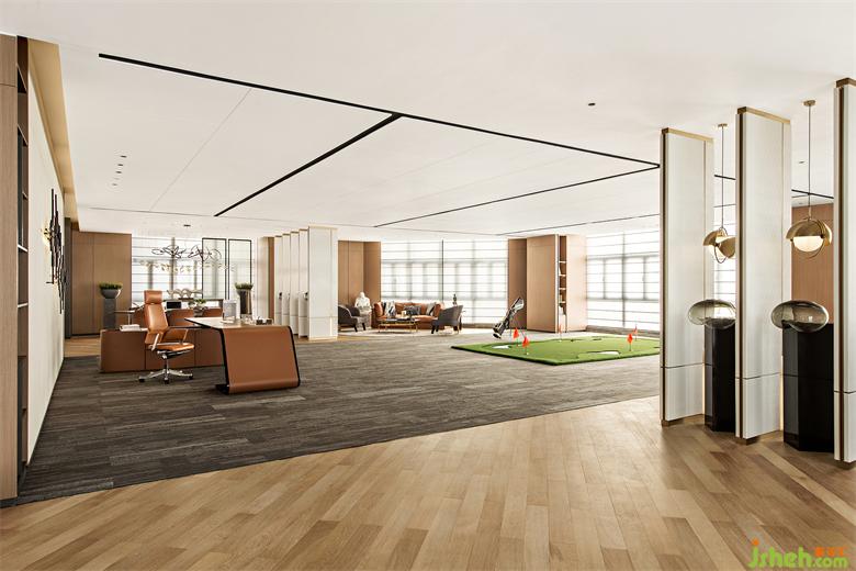 在遠洋新干線辦公的入口,辦公室設計師通過垂掉的玻璃燈柱,構建了一幅山型立體面,營造深遠莊重的氣勢;整個空間具備領導辦公、員工辦公、開放會議區(qū)、茶歇區(qū)、等候區(qū)、高爾夫娛樂體驗區(qū)的幾大辦公功能;在材料的選擇上,以玻璃和金屬的穿插點綴,提升辦公空間的藝術格調與輕奢感,米色與橙色的碰撞,形成輕松、自由的空間形態(tài)。