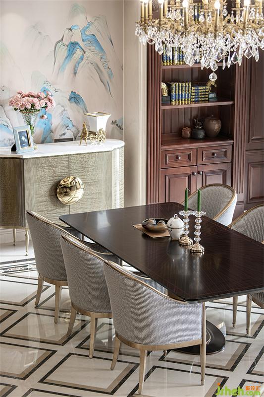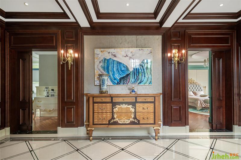 拾階而上,精美繁復(fù)的儲物柜與大理石拼花相映,來到開闊的二層居住空間。