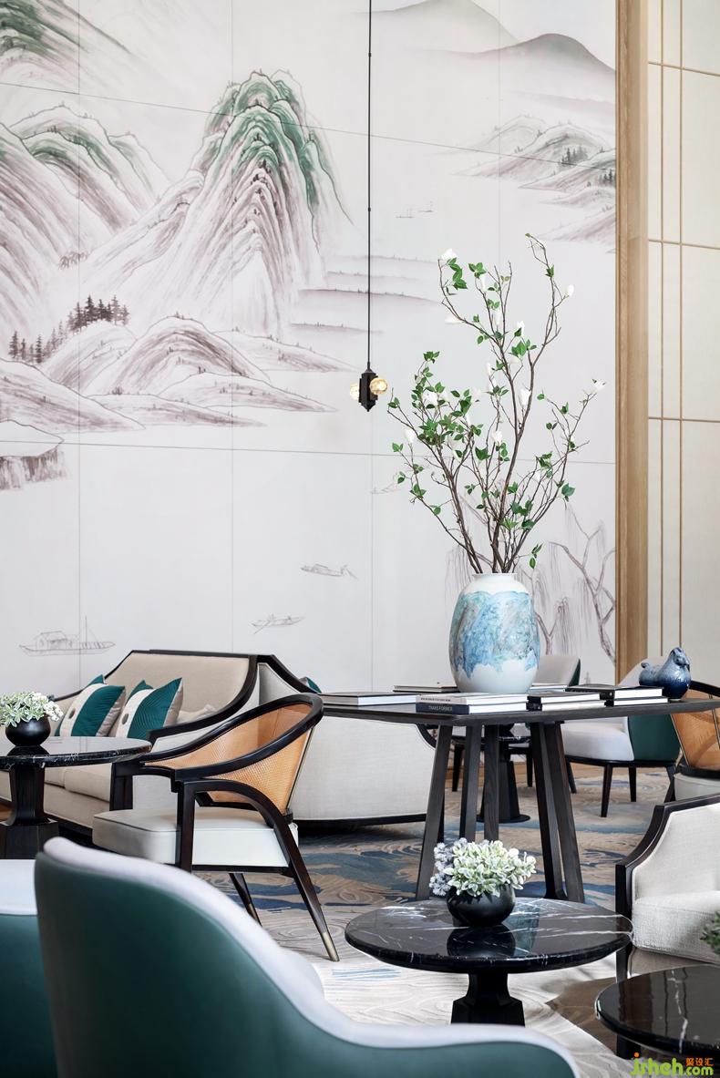 巨大的背景墻以騰沖山水入畫,山之巍峨與澗之幽靜悠悠相合。深綠色系的軟裝配飾與明晰的黑色線條搭配,仿佛滇西森林與原野的意境彌漫于整個空間,讓人感到清朗舒適。