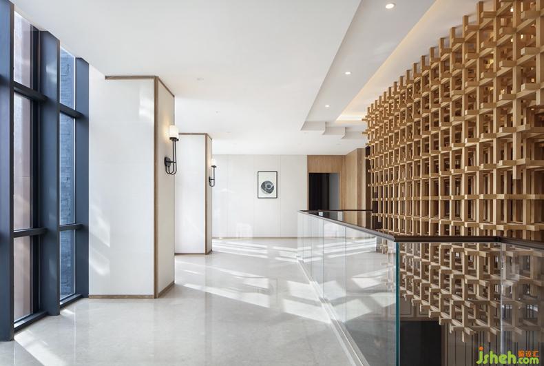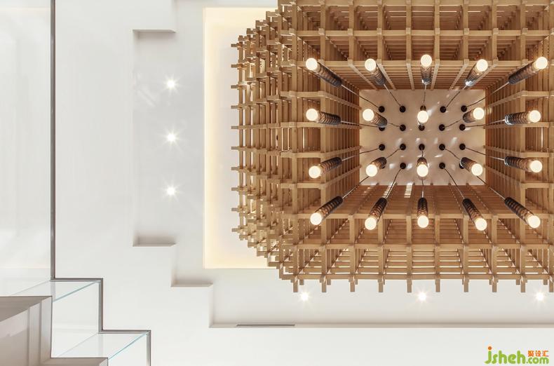 正廳上方,獨(dú)特的天花設(shè)計是空間的視覺中心所在,無數(shù)原木長條縱橫交錯,形成一個充滿張力的有趣立面,構(gòu)成主天花肌理。