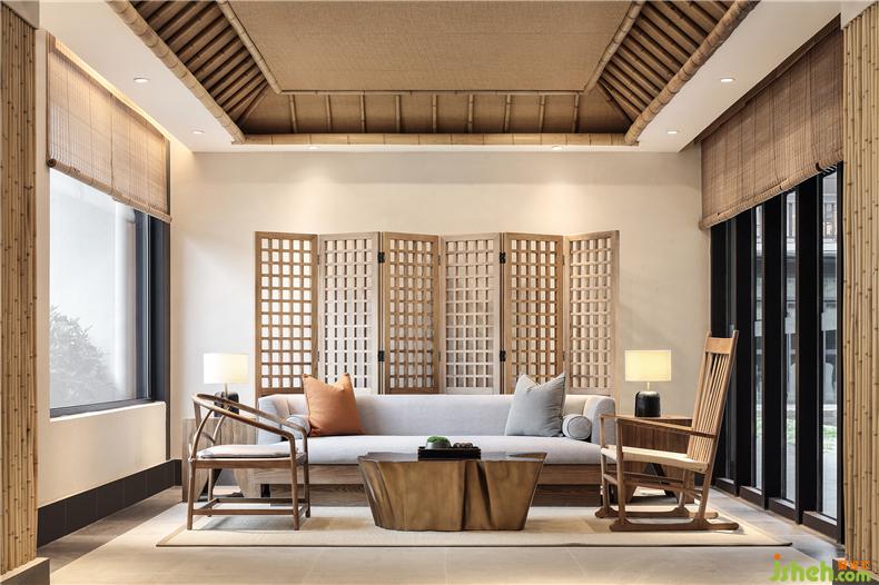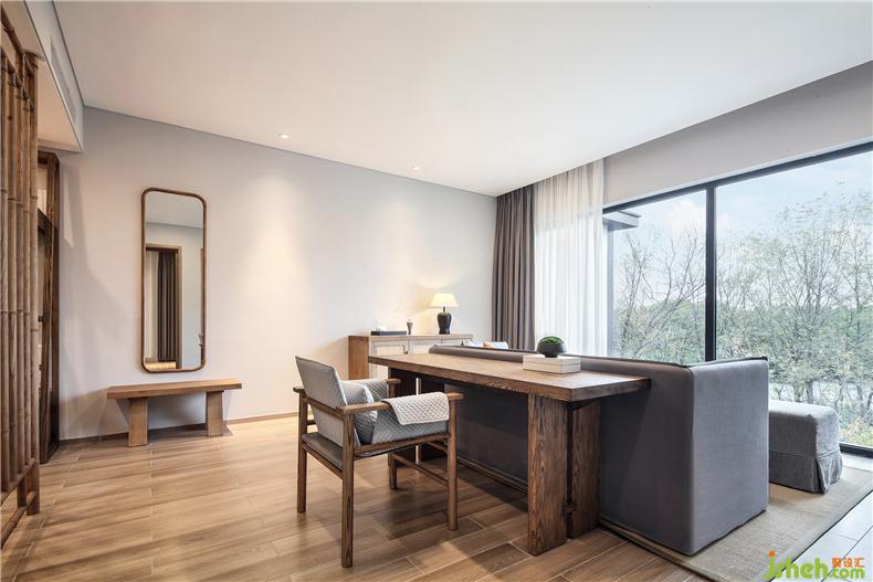 杏花柔媚,花色潔白,大堂延續(xù)著素雅之美;樹(shù)榴茶桌長(zhǎng)短廣狹不齊,置之于室,古雅溫潤(rùn);從疏線到編織,劍麻地毯的鋪陳,簡(jiǎn)樸之中清新蔓延。