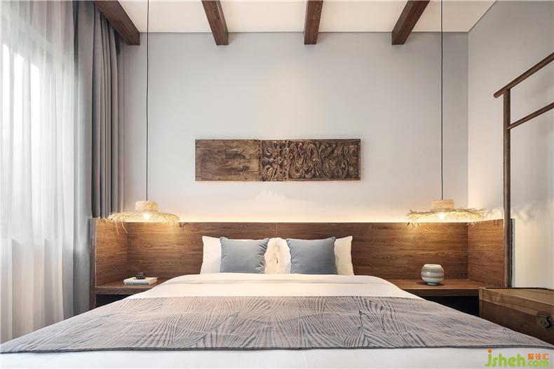 客房布草裝飾選用棉麻材質(zhì),色彩過(guò)渡柔和,給人暖意。酒店設(shè)計(jì)床頭的實(shí)木雕畫回歸原野古樸,竹編吊燈造型各異,一花一草一木皆入景,簡(jiǎn)而裁,巧而自然。竹藏風(fēng)雨,觸及野趣,山居生活隱逸悠然,靜念生長(zhǎng)。