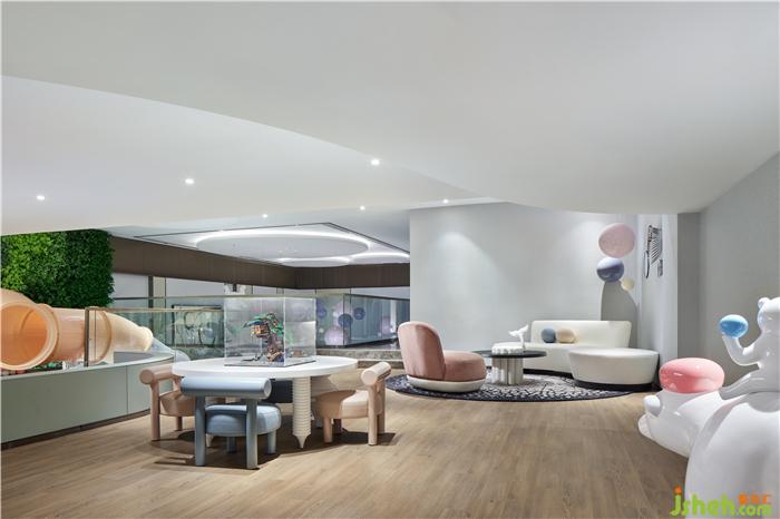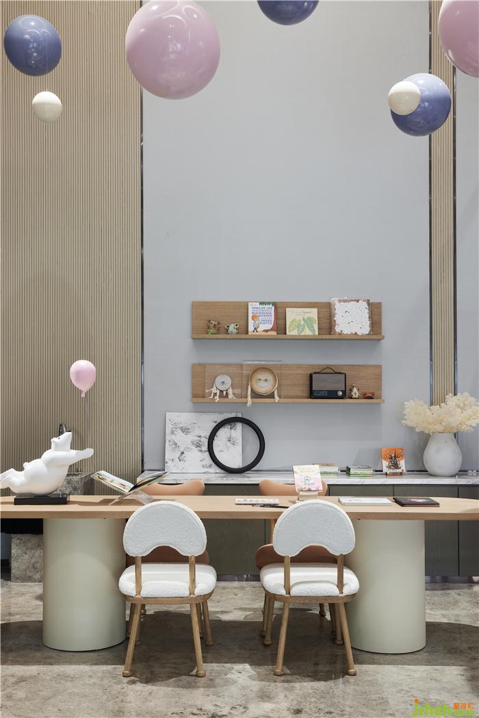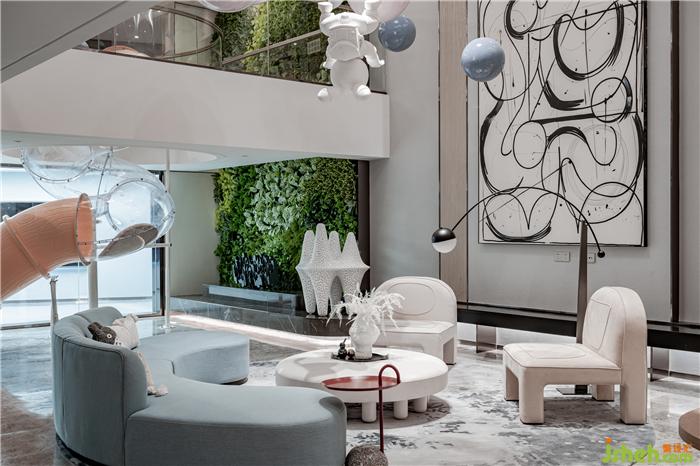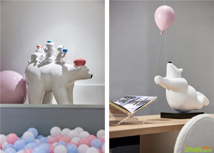 云朵熊的形態(tài)俏皮可愛(ài),手上的氣球讓人不禁聯(lián)想起電影《飛屋環(huán)游記》,老卡爾帶著氣球環(huán)游世界——大堂中央錯(cuò)落有致的吊球垂掛而下,像童真的夢(mèng),像童夢(mèng)的真。樣板房設(shè)計(jì)