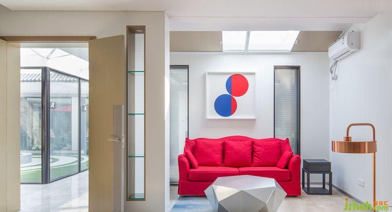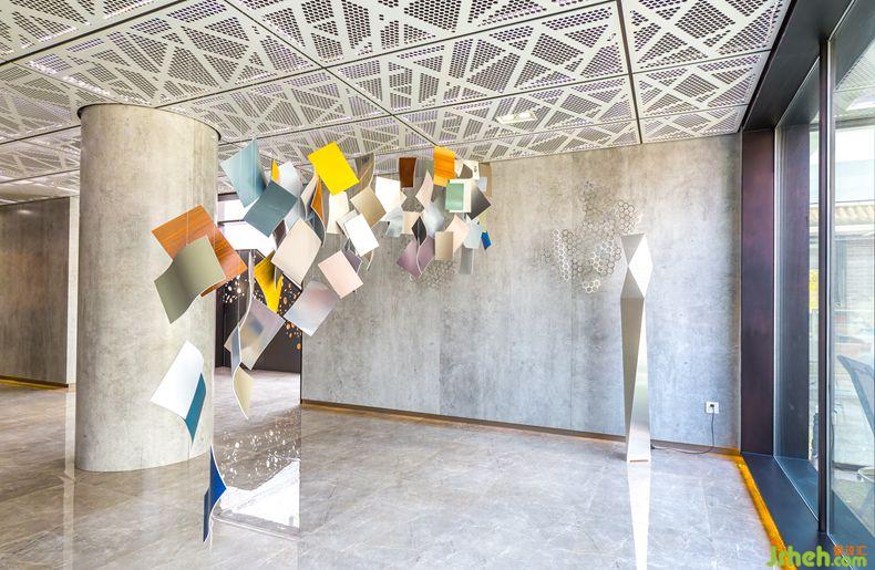 設(shè)計的最迷人之處在于空間和光線的追逐游戲。東西南北四側(cè)的房屋用中庭的圓圈環(huán)繞串聯(lián)起來,中庭用玻璃頂替代原有的磚瓦形式,將光線引入室內(nèi)。室內(nèi)樓梯采用穿孔鋼板打造,連接上下兩層空間,讓光影游戲穿梭在空間之中。自然光線通過通透的鋁板散落在地面上,被過濾后的陽光以肆意的姿態(tài)穿梭在空間中,溫和地包裹著這個溫暖人心的軟性環(huán)境。空間中的色彩運(yùn)用,大膽而不失細(xì)膩,鮮紅的沙發(fā)配上寶藍(lán)色與黃色的壁畫,以自身獨(dú)特的語言塑造空間的性格,形成不同的氛圍,木色辦公桌與綠植增添了鮮活的生命力。顏色的穿插柔和了鋁板的僵硬,室內(nèi)設(shè)計師從視覺比例上演變,通過現(xiàn)代感的材質(zhì)表達(dá)空間,使空間從細(xì)微到整體都充滿著活力。