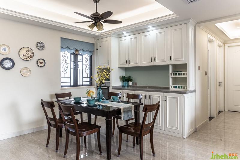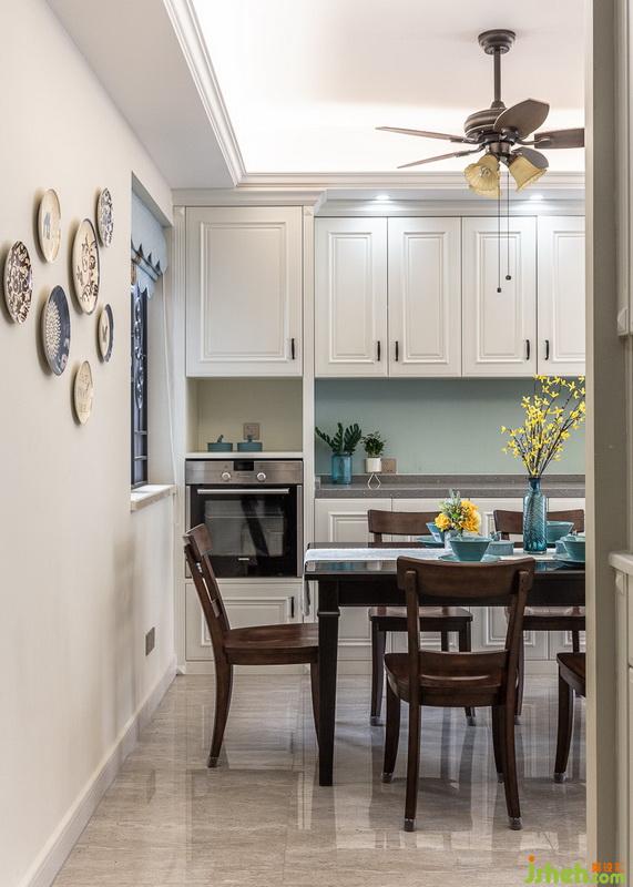 低調(diào)大氣的黑胡桃餐桌和餐椅顯得精致而典雅,餐廳背景的電器高貴和餐邊柜不僅納入了烤箱還提供了強大的收納功能。