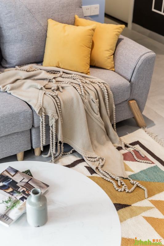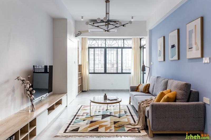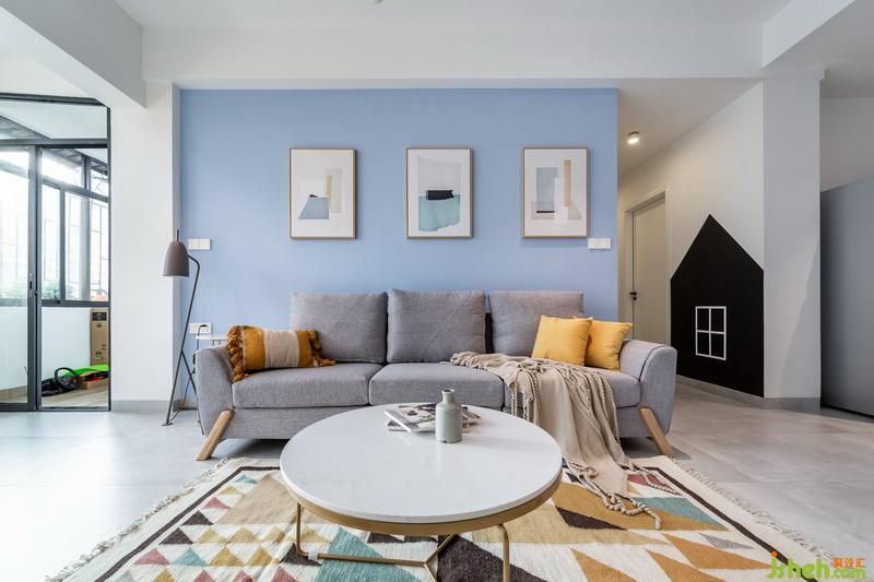 沙發(fā)背后那一抹藍(lán)色,跳躍起整個(gè)空間,靈動(dòng)而有魅力。電視背景和房門在同一平面,房門采用隱型門設(shè)計(jì),使有型藏于無形之中。