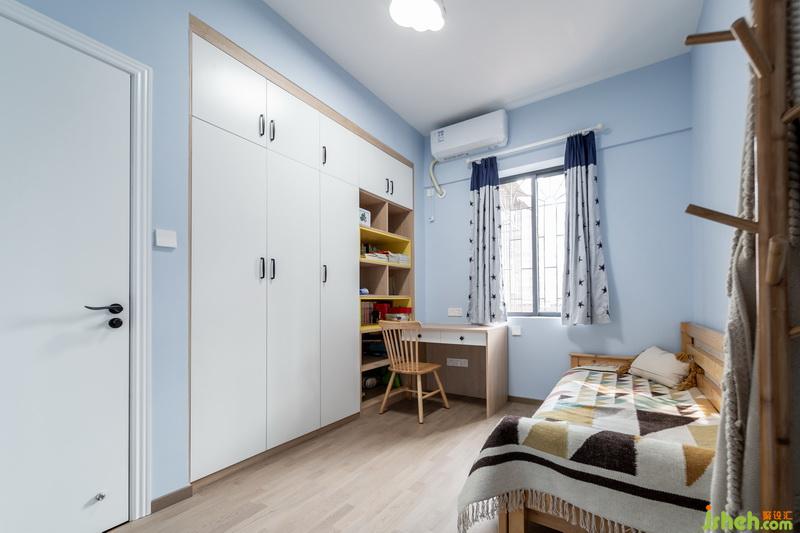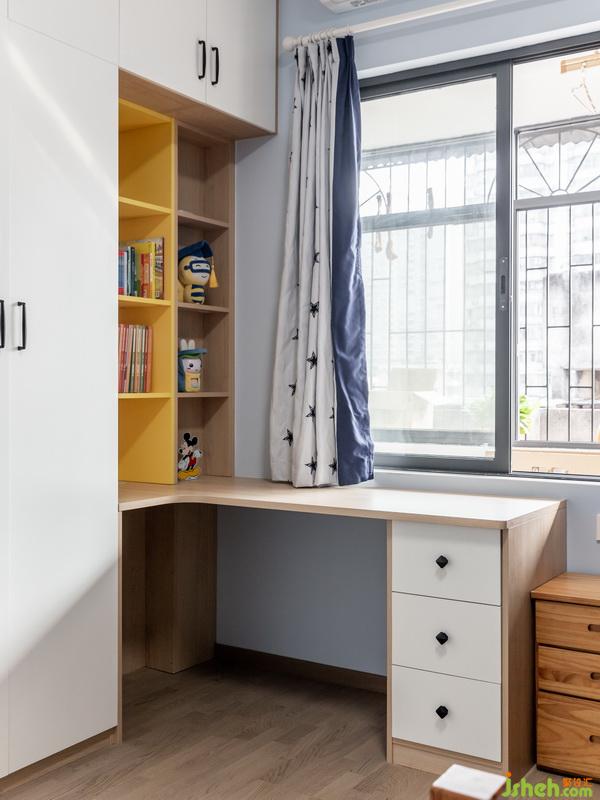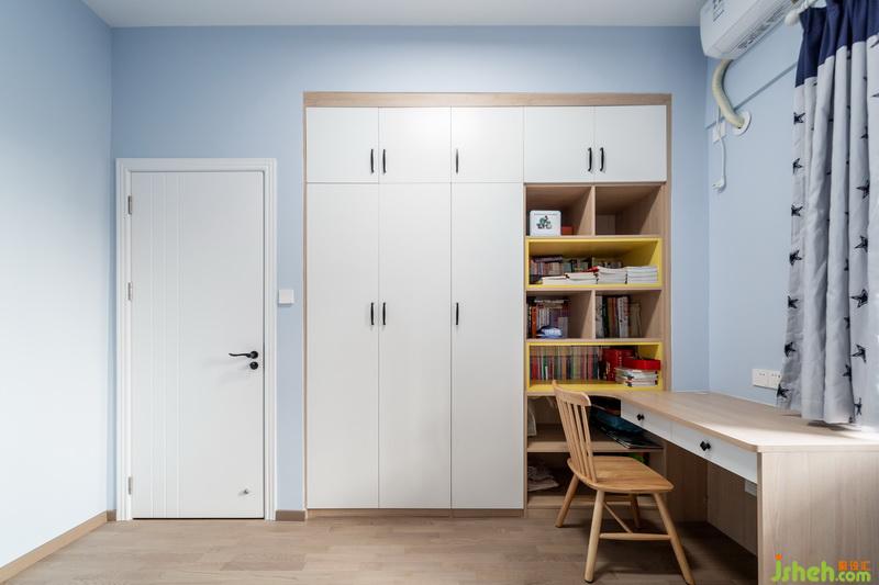 天藍色的墻壁,云朵造型的燈。黃色層板將書柜點綴得充滿生氣與活力,正適合小男孩聰明活潑的性情。