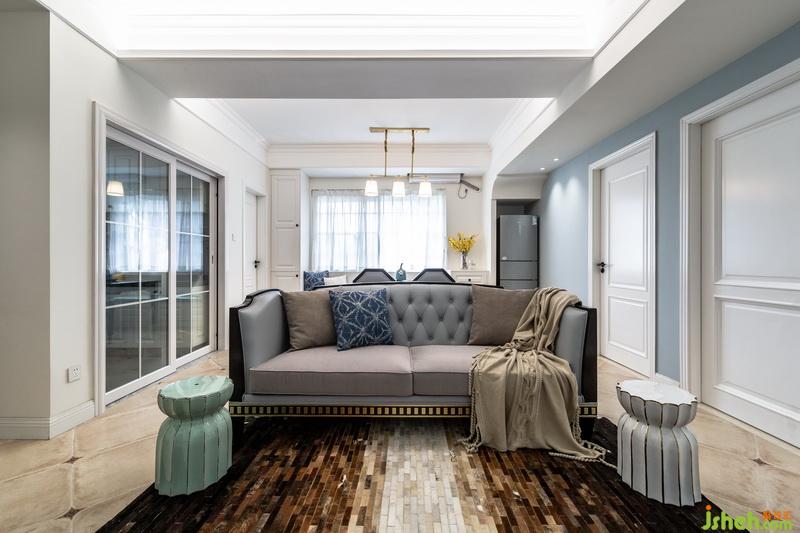 舊房改造有很多弊病,但也可以擁有更多可能。挪動整個墻體調(diào)整空間比例,臥室空間比起原來大而空的格局更加溫馨,客廳空間摒棄原有窘迫格局,方正通透。改動墻體而裸露出來的主梁,加以造型處理,讓客廳空間擁有了獨立的梳妝區(qū)和冰箱收納處,通過調(diào)整廚房衛(wèi)生間門洞尺寸及開門方向提升空間使用率?;宜{色作為空間主色調(diào),不飽和的冷色調(diào)營造空間靜謐氣質(zhì),胡桃木色家具點綴黃銅材質(zhì),穩(wěn)重又不失精致。