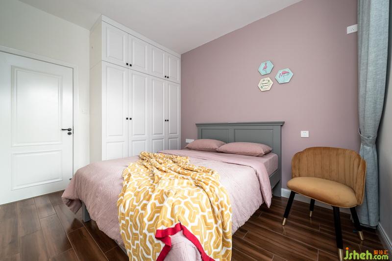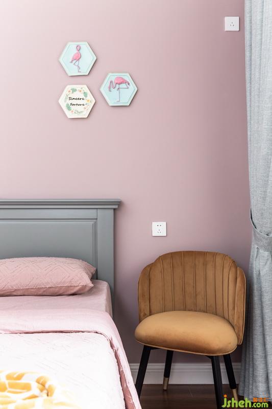 同一個世界同一個蘿莉,小朋友對粉色的喜愛你們一定能想象,但是業(yè)主不想要讓兒童房太過卡通,為中和兩者需求,不飽和的灰粉成為空間背景首選,家具挑選也簡單硬朗,床品也沒有大多兒童房的卡通圖案,而是選用磨毛格紋處理的灰粉色,通過這些小細節(jié)滿足小蘿莉的公主心。書桌暫時還用不上,所以在床邊擺放了一個主人房同款絲絨單人椅,既做床頭柜用,也是空間顏色的點綴。