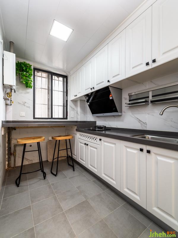 衛(wèi)生間廚房:原本廚衛(wèi)采光很好,初期考慮選用客廳同系列仿古磚,得知后期會在窗外加裝電梯的消息之后果斷換做白色墻磚,廚房靠窗位置原本是洗衣機和洗碗機的空間,考慮到暫時還用不上,這個位置便臨時充當了早餐臺的角色,衛(wèi)生間:藍色浴室柜作為空間點綴色,衛(wèi)生間也要清新活躍。