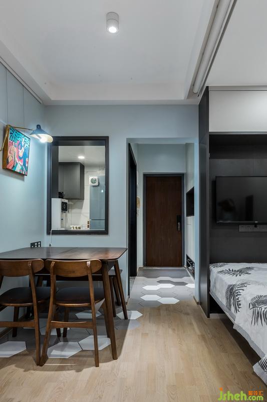 深淺灰白色六角磚如行云流水般呈現(xiàn)出來,拼接木色紋路自然木地板,自帶時尚與精致;踏進(jìn)家門那一刻,感受到卸下所有的疲憊,可以活一個比較簡單,比較直接比較充滿家庭氣息的生活。