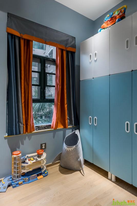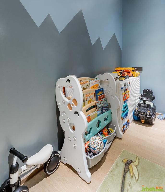 當淺藍色墻壁與灰色黑板墻碰撞,小男孩隨意涂畫著他成長的印記;帳篷式上下床、組合衣柜為小朋友增添有趣成長空間。
