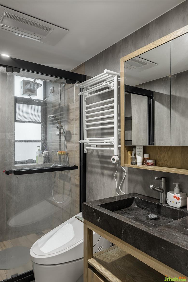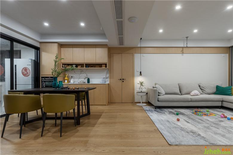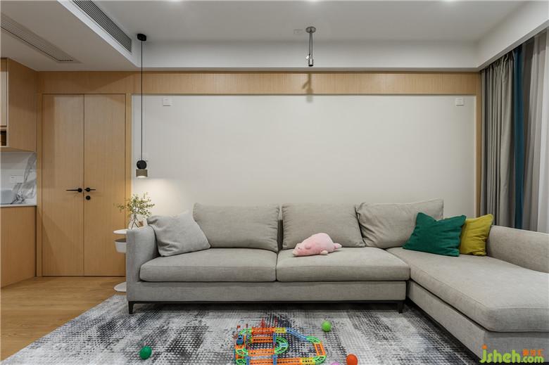利用隱形門和護(hù)墻板造型的延伸,將沙發(fā)墻做成一整面完整的背景,也完美的將主臥和書房與客廳完美分割,書房和主臥成為相對(duì)獨(dú)立的套房。木色背景搭配淺灰色沙發(fā),點(diǎn)綴墨綠色抱枕,溫暖又清爽。
