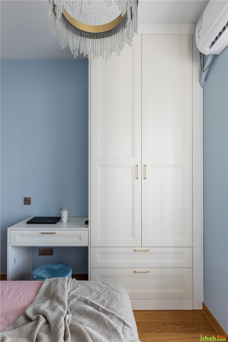 次臥的兔子床是主人給閨蜜精心挑選的,同時也滿足自己的少女心。整個空間的色調(diào)也是以灰藍色為主,清新淡雅。大大的L型飄窗是全屋風(fēng)景最好采光最好的位置了,偶爾周末閨蜜過來蹭住,時而在飄窗上閑聊,時而兔子床上悄悄話,幸福而知足的生活也莫過于此了吧。