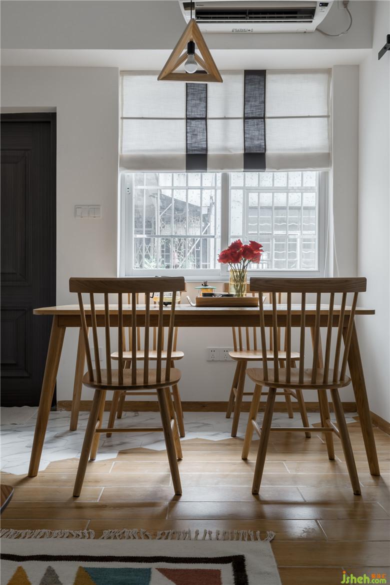 地面爵士白的六角小花磚與自然木紋磚的結(jié)合,讓原本面積不大的客餐廳增加了視覺的延伸,木質(zhì)家具的運(yùn)用讓自然的感覺更加強(qiáng)烈。
