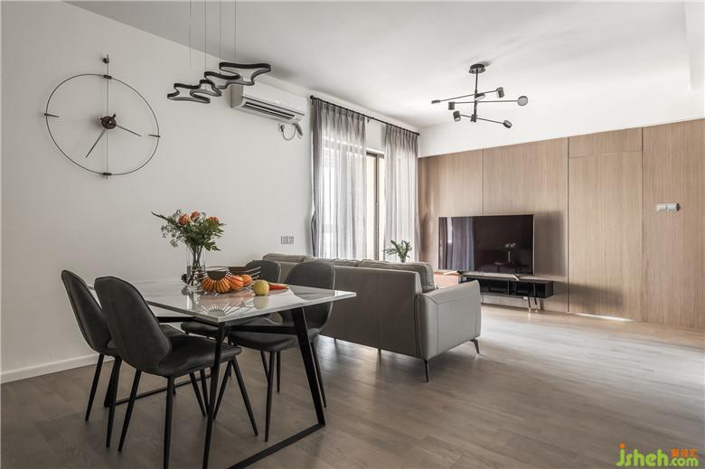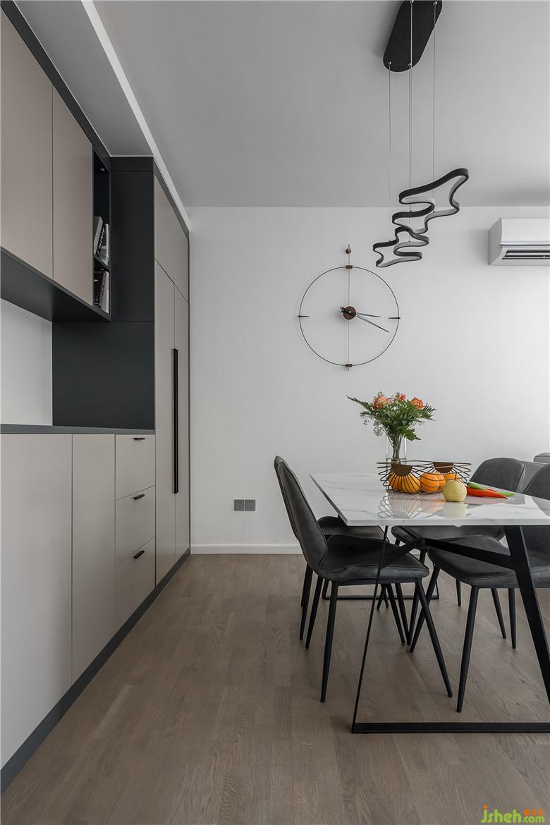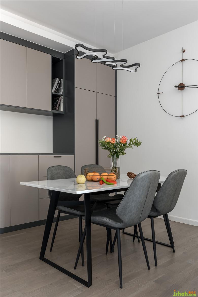 胡桃木色與煙灰色的結(jié)合讓空間更加簡(jiǎn)約大氣,胡桃木色結(jié)合本身富有質(zhì)感的紋理,木地板與背景飾面板的木色紋理的呼應(yīng),凸顯整個(gè)格局的亮點(diǎn),定制與門(mén)的材質(zhì)選用煙灰色與咖色的融合,避免了灰色的過(guò)于清冷,讓家的氛圍更加柔和,沙發(fā)選用簡(jiǎn)潔的灰白色,與爵士白大理石的餐桌融合,讓住宅更有格調(diào)。