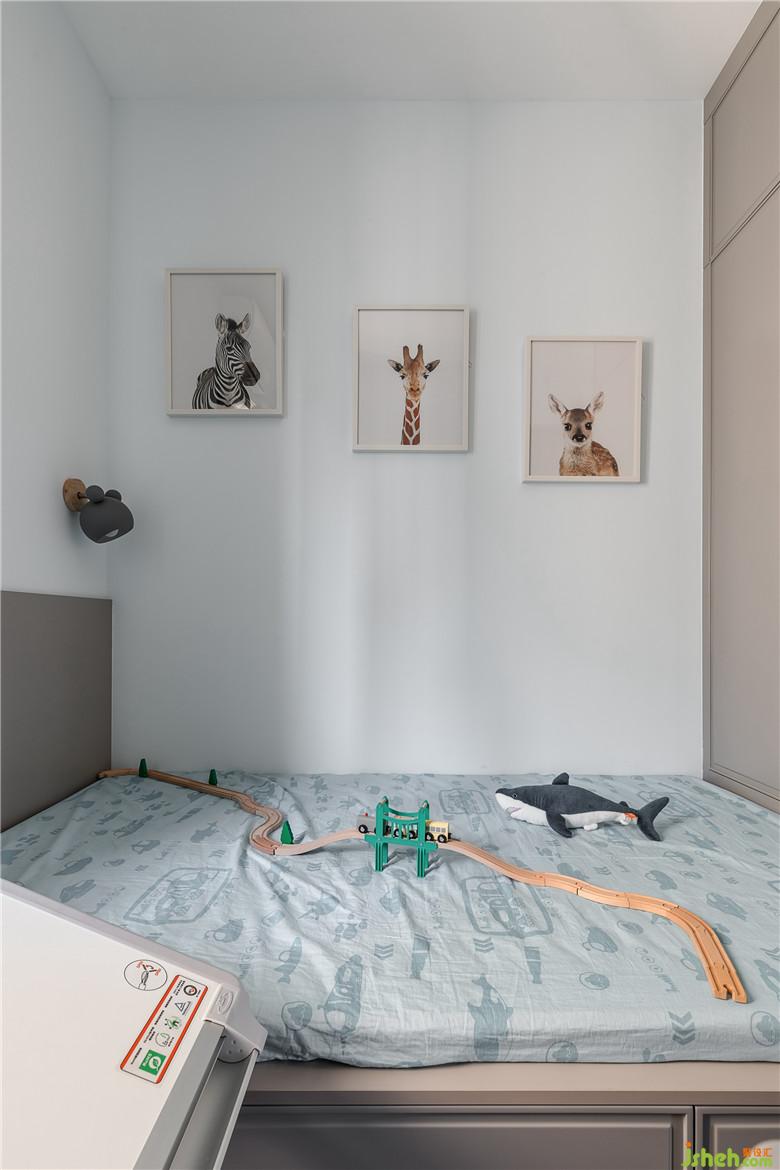 榻榻米與衣柜的組合形式,增強(qiáng)了兒童房的收納空間,讓小朋友的玩具更能方便儲(chǔ)藏。小動(dòng)物的掛畫(huà)與藍(lán)白結(jié)合的窗簾作為點(diǎn)綴,更能突出兒童房的童趣。