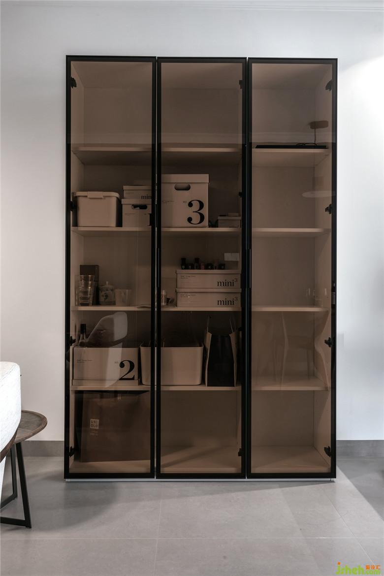 餐廳;深色的餐桌餐椅與灰藍(lán)色的墻面搭配,充滿輕重緩急的節(jié)奏感,旁邊的置物柜,透明玻璃的柜門,簡單利落柜體線條