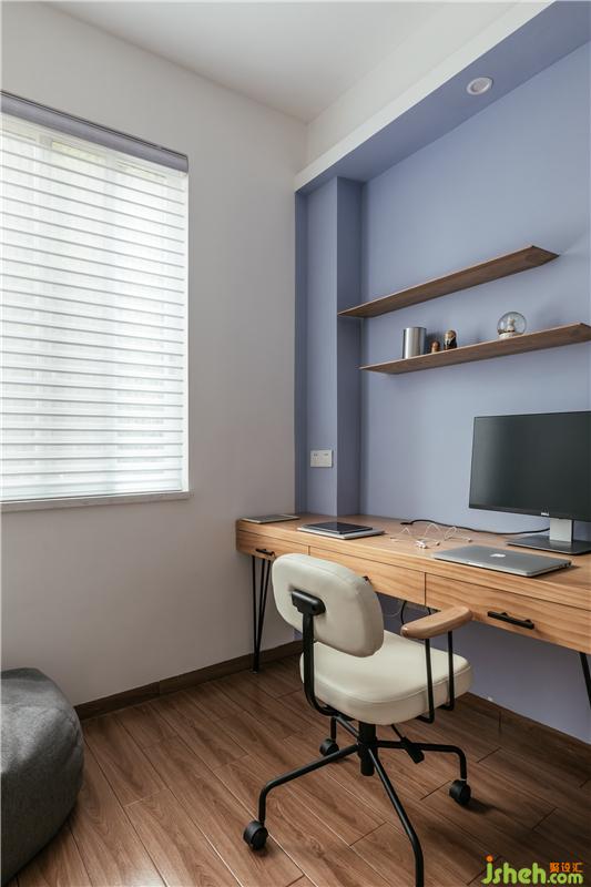 這個(gè)空間既是衣帽間,又是書房。除了整排的大衣柜,還兼顧了書柜、雙人書桌,滿足業(yè)主現(xiàn)在的需求。日后有了小朋友,可移動(dòng)書桌,改變成為小孩房。
