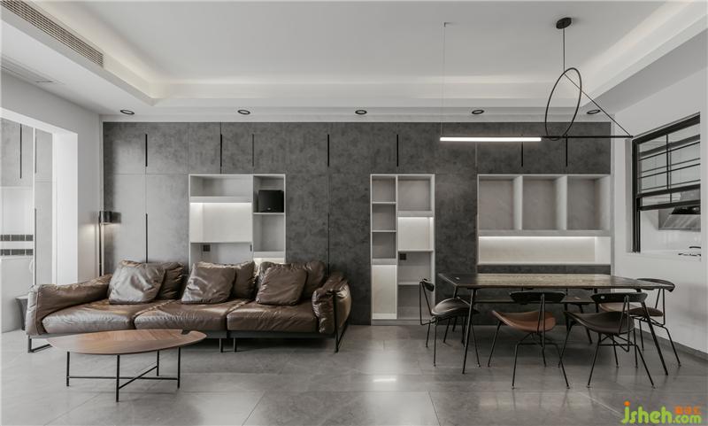 男主人愛(ài)死這儲(chǔ)物柜的色調(diào) ,他說(shuō)當(dāng)光打在上面時(shí),那種若聊若現(xiàn)的基理效果真的是百看不厭,在這個(gè)空間中,沙發(fā)背景裝飾柜的比例非常大,所以在款式與色板上的挑選就尤其重要。