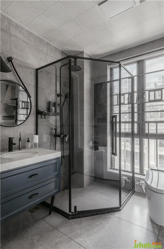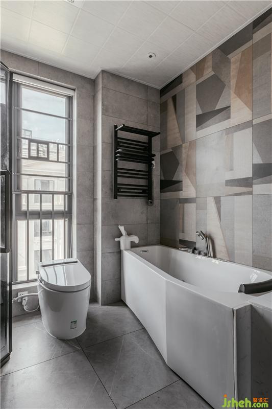 主衛(wèi)空間大,所以功能安排也齊全,沐浴區(qū),洗漱區(qū),泡澡浴缸等等全都擁有。主衛(wèi)的風格依舊是以灰色調為主,在浴缸的一面墻上運用了不規(guī)則呈幾何性的花磚來進行空間點綴,干凈,內斂,現(xiàn)代依舊是我們想表達的主題。