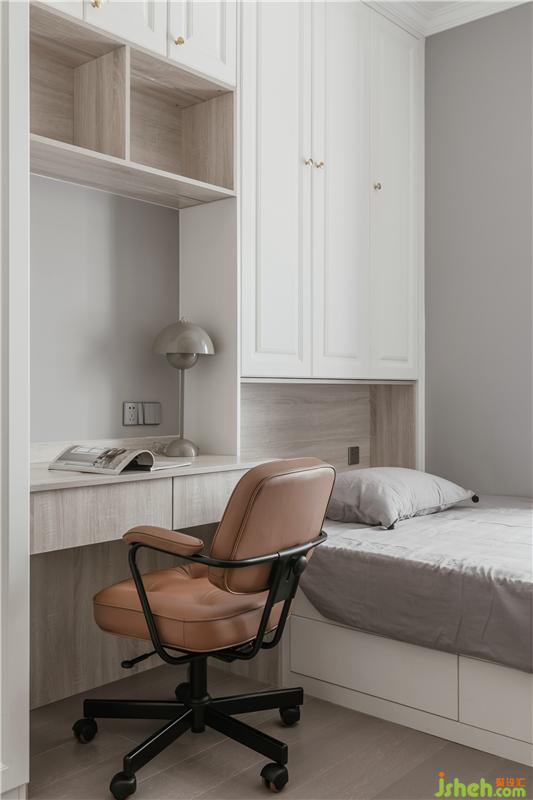 灰色的床品,奶灰色的背景讓整個裝修設(shè)計(jì)風(fēng)格得以延伸,設(shè)計(jì)師在軟配上用灰藍(lán)色做點(diǎn)綴,為臥室營造寧靜的氛圍。