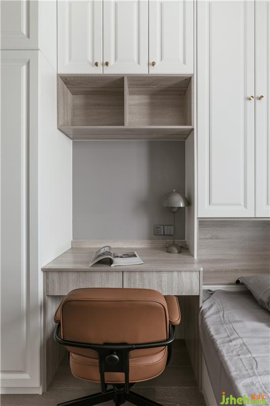 未來的小孩房,收納式榻榻米,讓活動空間最大化還解決大量的收納空間。米白色的柜門與奶灰色墻面形成鮮明對比,再配上灰橡木的開放層板,使空間簡潔明亮又不單調(diào)。