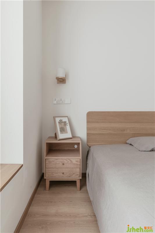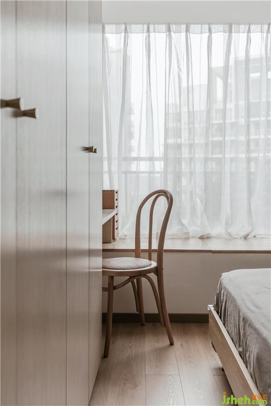主臥的整體設(shè)計是非常溫暖,寧靜的,柜子的木色選擇,以及家具的風格都很有考究,衣柜的一側(cè)作為書桌滿足了女主人的辦公,超大的飄窗,讓空間顯得更寬敞明亮。