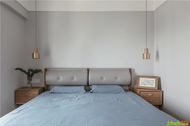 主人房借用了長(zhǎng)輩房的一點(diǎn)空間,做了一個(gè)大衣柜進(jìn)行收納,滿足了夫妻兩人的日常居住需求。臥室延續(xù)外部空間的設(shè)計(jì)元素,作為休息區(qū)域,塑造的氣氛更為靜謐優(yōu)雅。原木、棉麻、綠植也在經(jīng)過(guò)紗簾過(guò)濾后的陽(yáng)光下顯得更加柔和。
