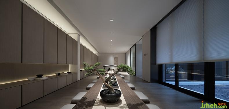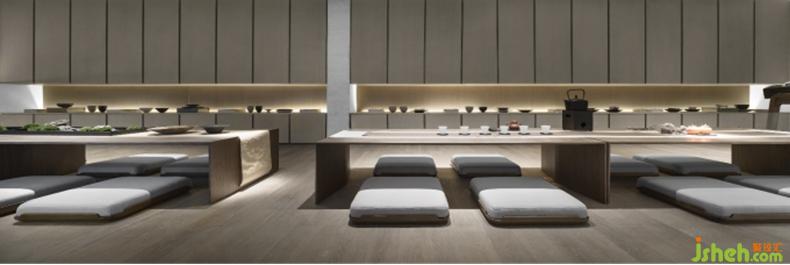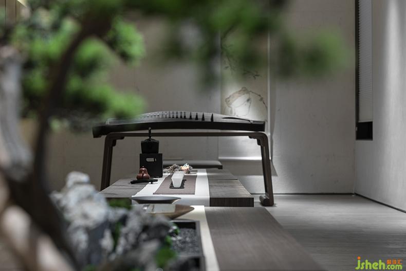 茶室家具木色與硬裝木色相近,為中性暖木色,茶桌不高,旨在讓人進(jìn)入空間學(xué)會(huì)放下自己,盤腿而坐。前座備有琴桌,中座則布有茶席,后座是小景式山石加植物,背面更有日式枯山水相襯,加之側(cè)面墻的展示臺(tái)處展示的中式書籍及不同質(zhì)感的陶瓷盛器。仿佛一場(chǎng)盛大的文人雅集活動(dòng)即將開場(chǎng)。一人撫琴,一人泡茶,眾人低首聆聽。與茶室正側(cè)方懸掛著德梵的《清涼》繪本欲要表達(dá)的一般,“若識(shí)本心,即是解脫”。