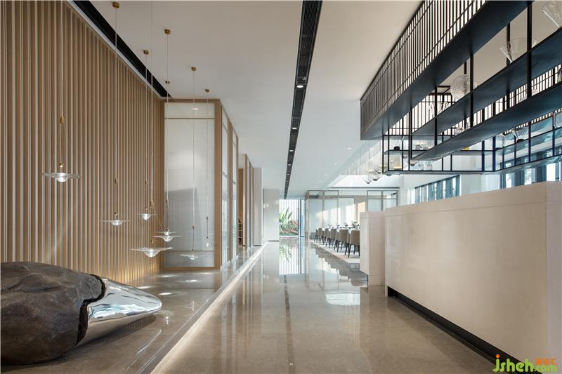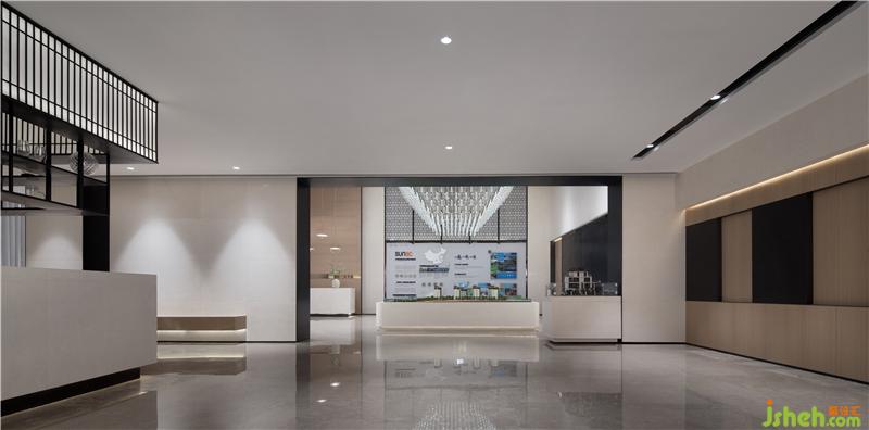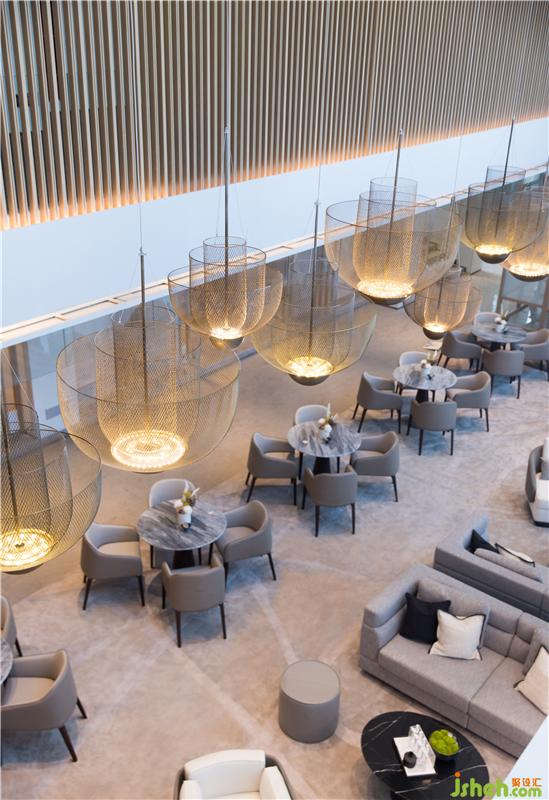 洽談區(qū)倚靠窗邊,窗外一片水景。室內(nèi)大面積以天然木色為基調,暖灰色系皮革與棉麻布藝結合的家具,營造舒適的洽談區(qū)。裝修公司