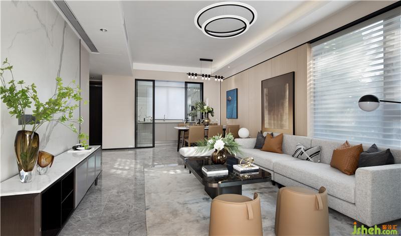 淳則之居為四室兩廳三衛(wèi)的疊拼戶型,整體面積為119平方米。本案選用暖灰色為主色調(diào),局部木紋肌理和大理石,使空間散發(fā)出當(dāng)代的氣息。樣板房設(shè)計(jì)