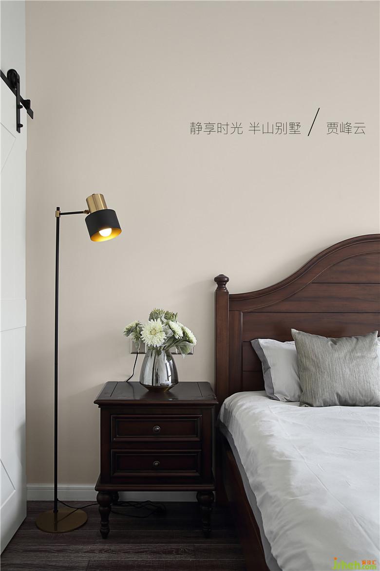 臥室格調(diào)優(yōu)雅米灰床具配以紅色麻布窗簾為安靜的休息空間增添些許私密感